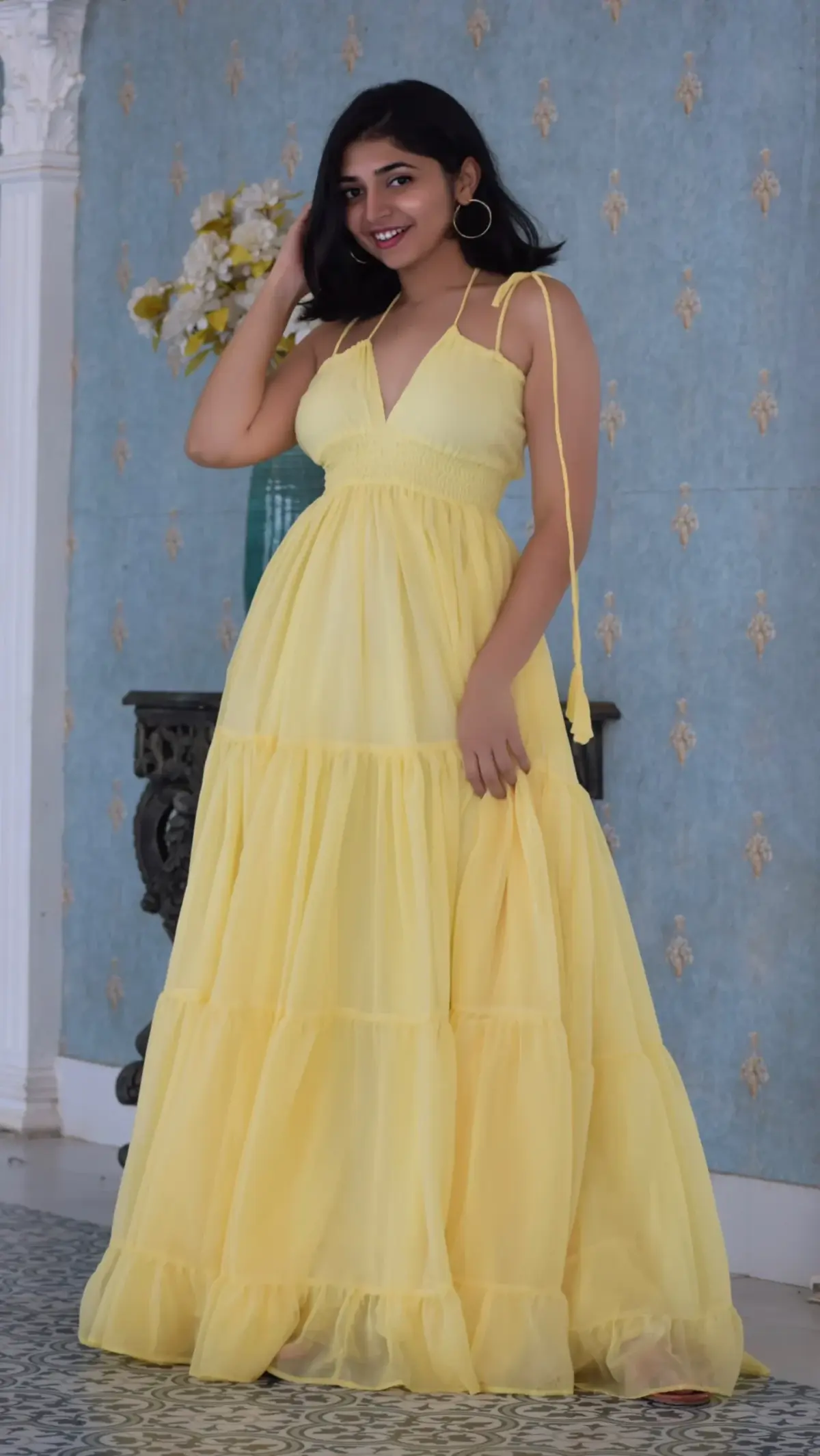 Elevate your style with our Lime Yellow Georgette Long Dress. The smocking pattern at the waist accentuates your figure, offering both comfort and a flattering fit. The charming tie-on knots add a touch of elegance, making this dress perfect for a wide range of occasions. Embrace the vibrant hue and timeless design for a look that’s both modern and chic.