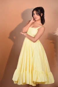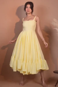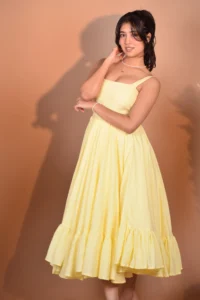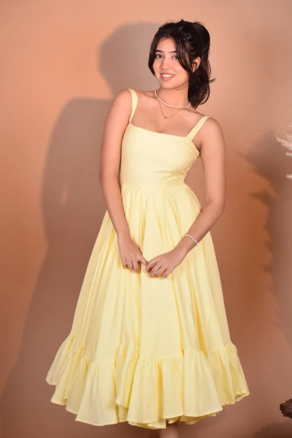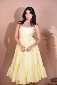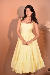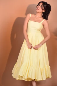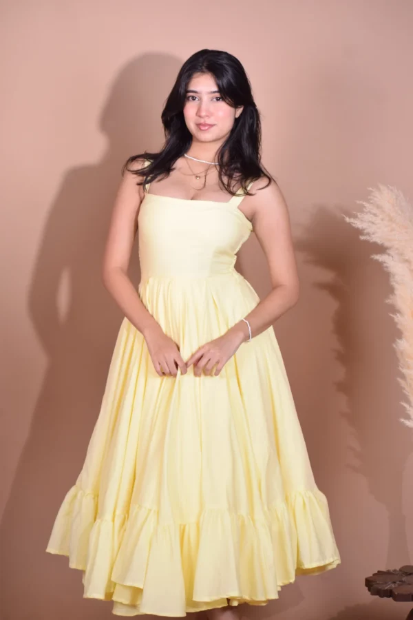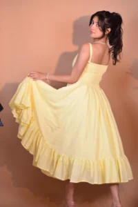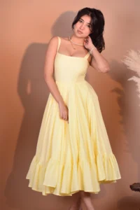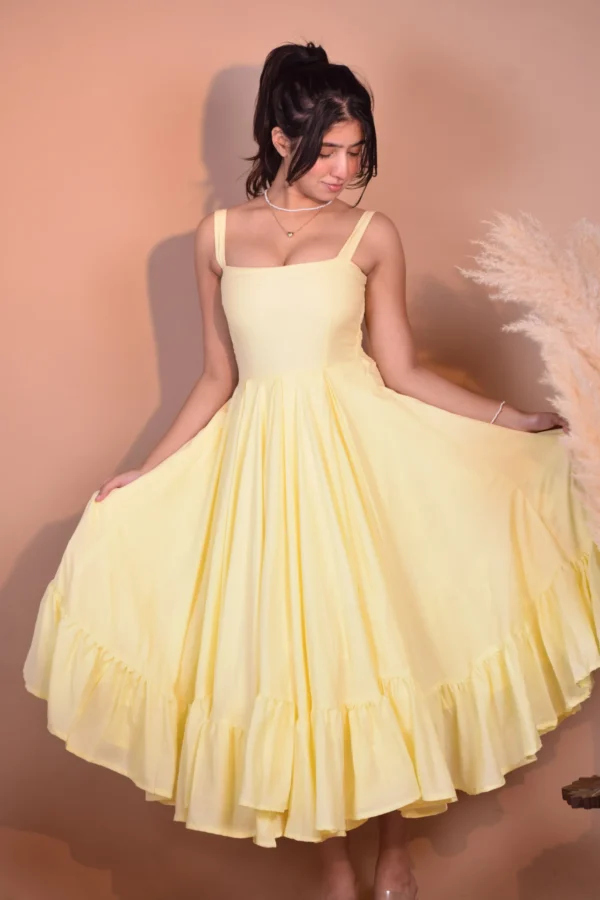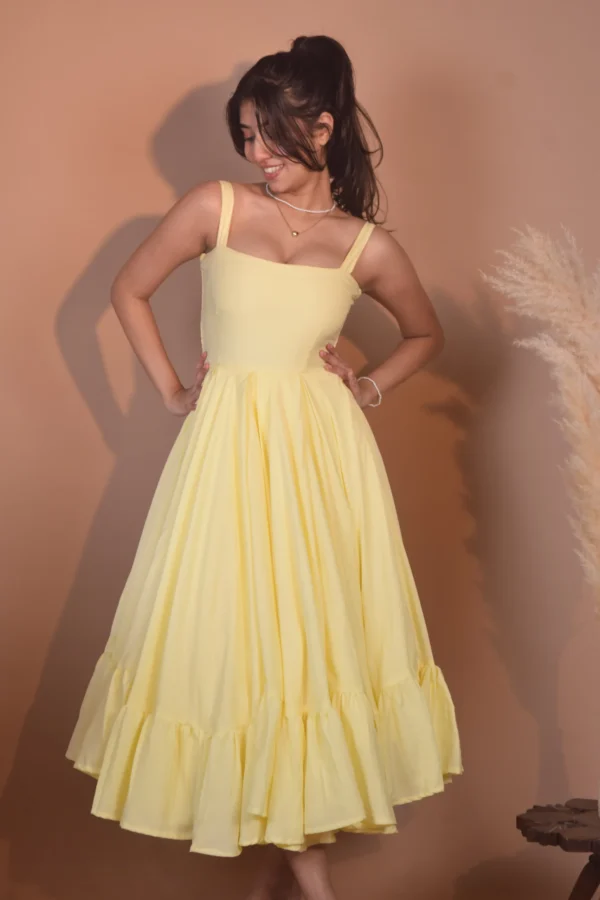 A perfect blend of playful and elegant. With a soft, airy fabric that moves beautifully with every step, it features a flattering silhouette and a flared skirt that adds a touch of whimsy. The gentle yellow hue exudes warmth and sunshine, making it ideal for sunny days or a casual brunch with friends.